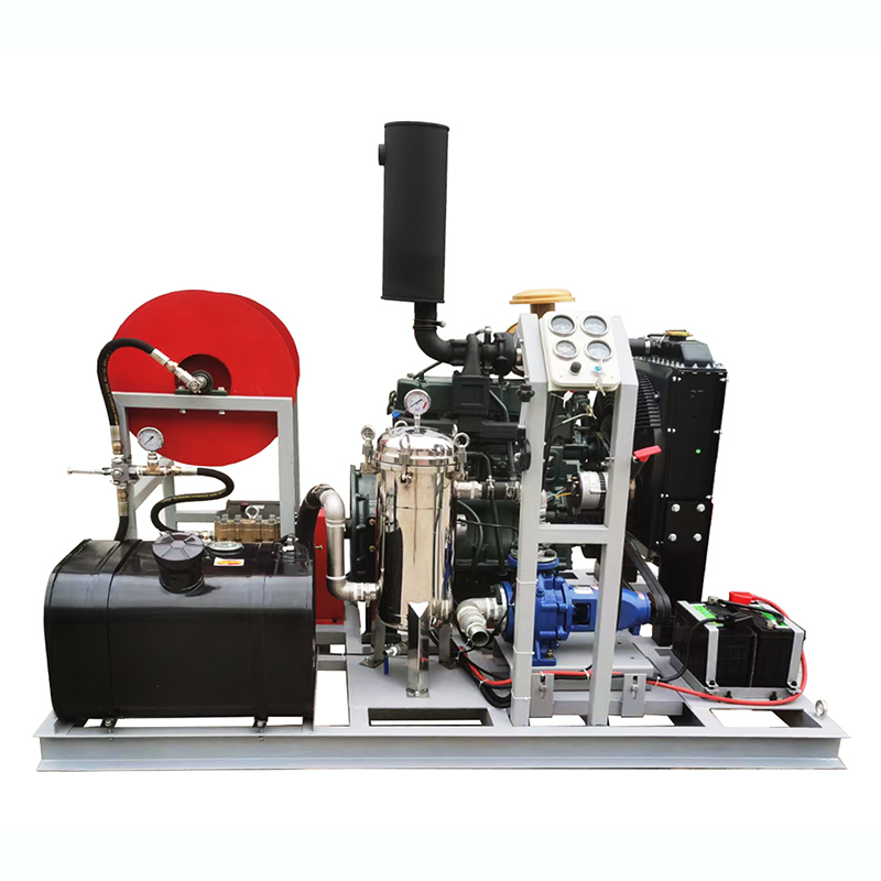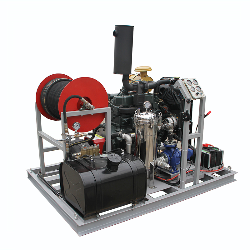 產品優點 | 55KW柴油機驅動,動力強勁 卷管器收納高壓膠管,使用整潔方便 意大利HAWK泵,100L/min大流量 意大利進口調壓閥,輕松實現0-20MPa調節 采用不銹鋼袋狀過濾器,保證水質高要求 機油表、水溫表、油溫表等實時顯示 | ||||